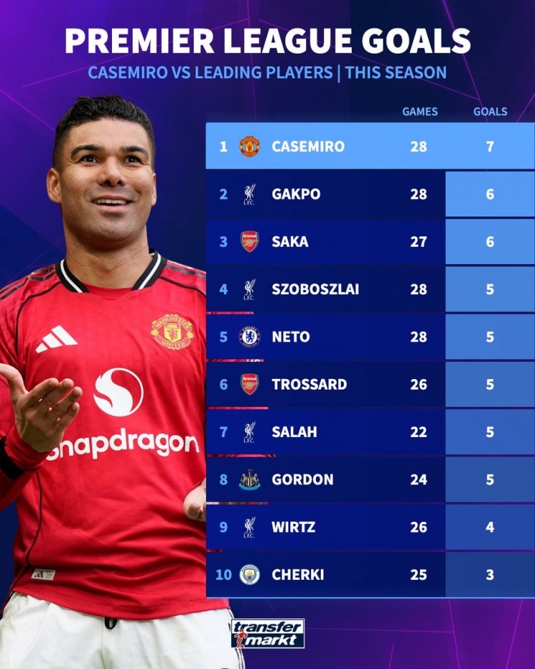 3月16日讯 英超第30轮比赛,卡塞米罗破门,曼联主场3-1击败维拉。德国转会市场统计了卡塞米罗与部分顶级球员本赛季英超的进球数量。